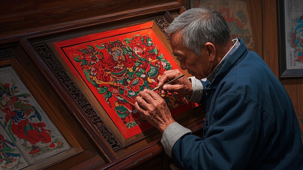 推开祖庙旁那扇有些年头的木门,混合着墨香与木屑的气息扑面而来。七十岁的冯兆强师傅正俯身在工作台前,刻刀在梨木板上轻轻游走,刀背敲打的“笃笃”声里,一张红脸关公的眉眼正从刻板里慢慢“醒”过来。